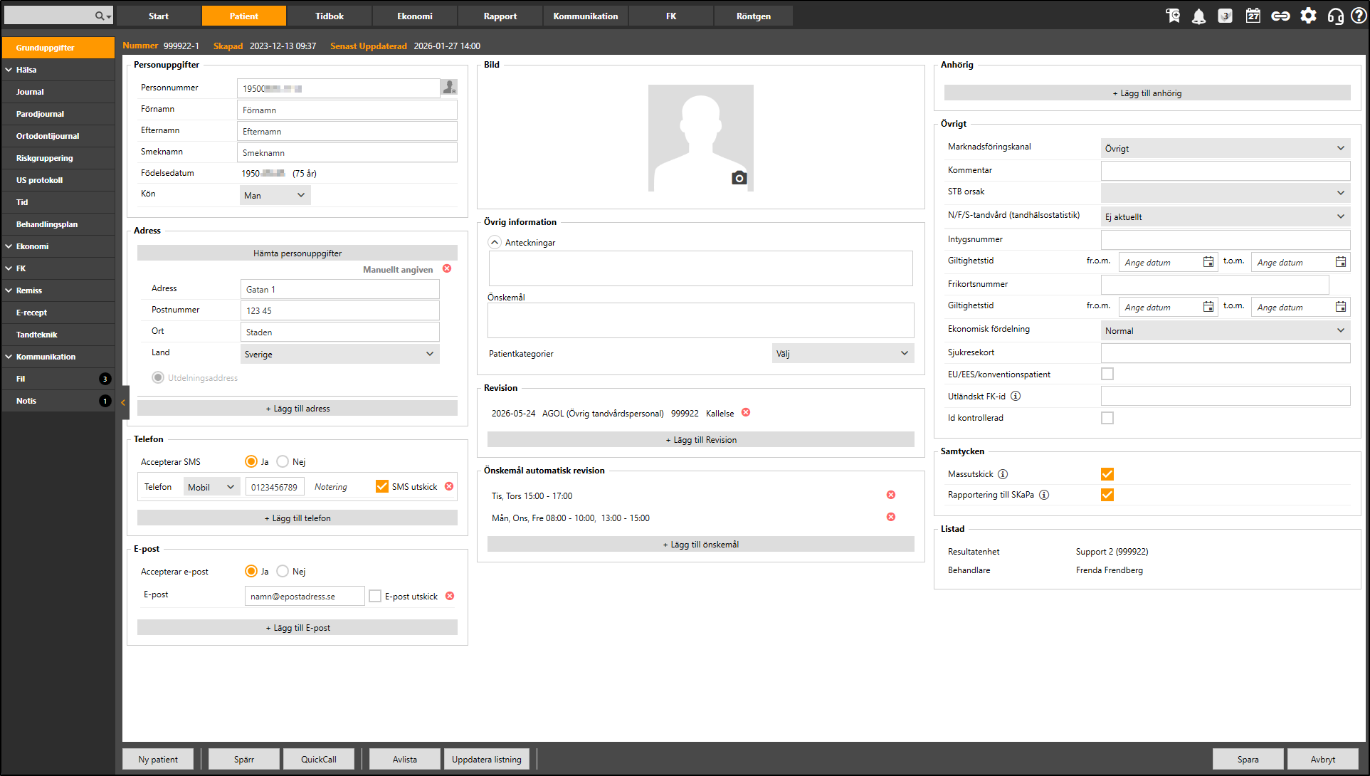Patienter registreras med personnummer (när det inte finns, se Reservnummer). För- och Efternamn anges (och ev smeknamn). Födelsedatum och kön fylls i per automatik utifrån det personnummer som anges, finns inte de fyra sista siffrorna anges kön som Okänd.