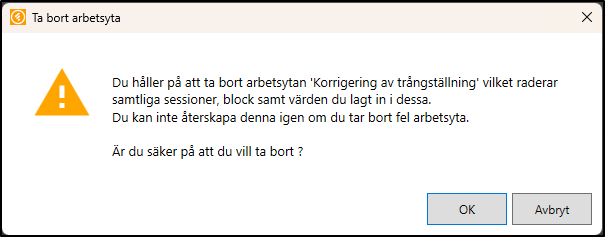 Vid borttag av arbetsyta tas samtliga tillhörande sessioner, block och inmatade värden i arbetsytan bort. Det går inte att ta bort arbetsytor som innehåller låsta block och en borttagen arbetsyta kan inte återställas.