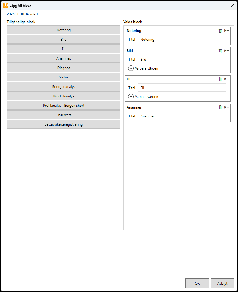 Block är de arbetsmoment som ingår i ett besök/session. En session kan innehålla flera olika block med olika blocktyper. Varje enskild blocktyp har olika värden och information som går att fylla i. Följande blocktyper finns: Notering, Bild, Fil, Anamnes, Diagnos, Status, Röntgenanalys, Modellanalys, Profilanalys - Bergen short, Observera och Bettavvikelseregistrering.