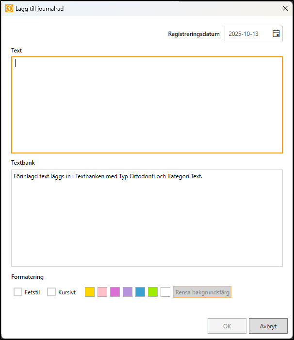 Skriv valfri text eller använd förinlagda texter från Textbanken, kategori Ortodonti och typ Text.