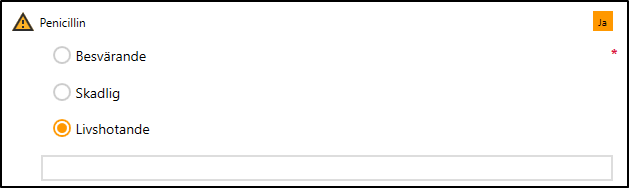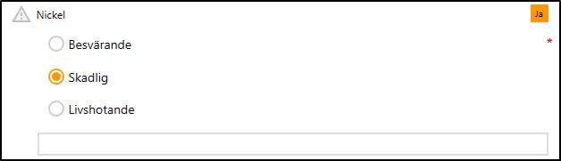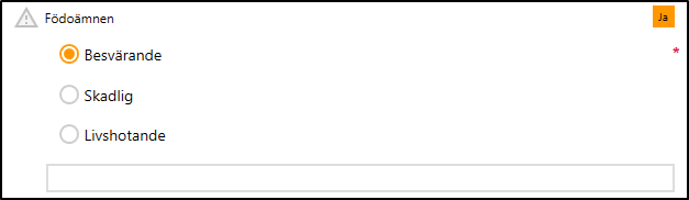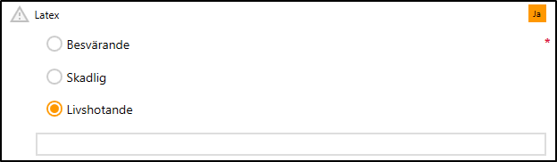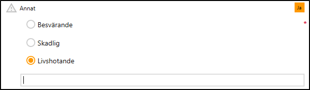 Vid Ja visas alternativ Besvärande, Skadlig och Livshotande som är obligatoriskt att ange. Skadlig är förvald och kan ändras till annat alternativ.
