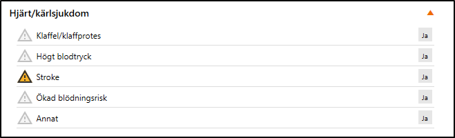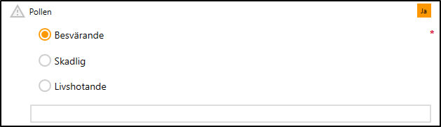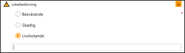 Vid Ja visas alternativ Besvärande, Skadlig och Livshotande som är obligatoriskt att ange. Besvärande är förvald och kan ändras till annat alternativ.