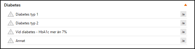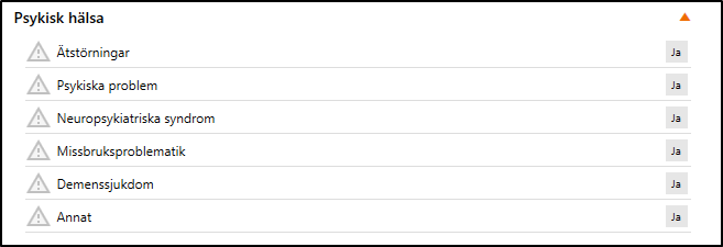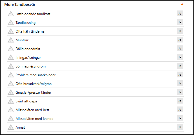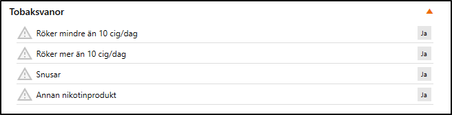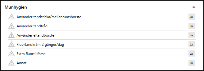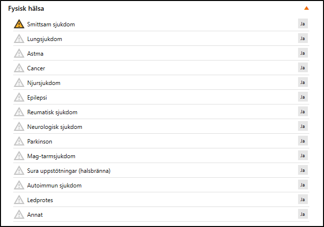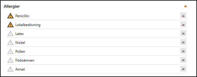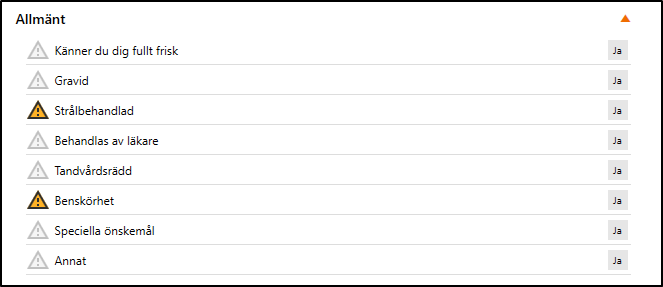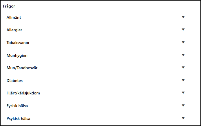 Frågor i hälsodeklarationen hanteras inom olika områden i hälsodeklarationen, till varje område finns ett flertal frågor. För att fylla i patientens svar behöver respektive område vara expanderad. Det är enbart Ja-svar som ska fyllas i. Frågor besvarade med [Ja] kan kompletteras med ytterligare information i det anteckningsfält som öppnas. För område Allergier är det vid [Ja] obligatoriskt att ange Besvärande, Skadlig eller Livshotande.