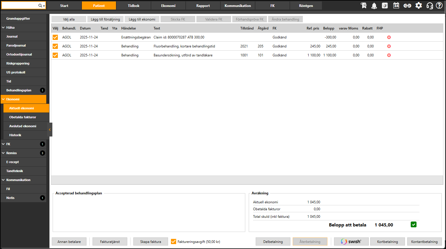 Aktuell ekonomi visar all pågående ekonomi (ej fakturerad/slutbetald) för vald patient. Debiteringen kan läggas till från journalen när journalanteckning skrivs, från behandlingsplanen eller direkt i Aktuell ekonomi.