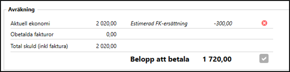 Beloppet visas som "Estimerad FK-ersättning" längst ner till höger i fält "Avräkning"