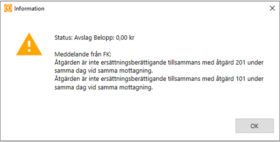 När Försäkringskassan meddelar Avslag för validerade åtgärder/tillstånd visas ett informationsmeddelande: