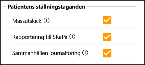 Begrepp "Samtycke" har ändrats till "Patientens ställningstaganden" för att förtydliga funktionaliteten för användaren. Till varje ställningstagande finns en informationsruta där det går att utläsa exakt vad ställningstagandet betyder. En markering betyder att patienten accepterar ställningstagandet. Ändring av text och begrepp har skett i samarbete med jurist och DPO för att hjälpa användare att göra rätt.