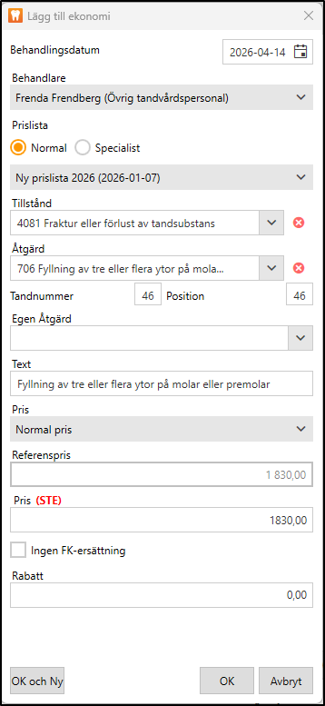 Det är nu möjligt att ange "Ingen FK-ersättning" även för patienter som omfattas av STE. Det fungerar vid debitering från Journal, lägg till ekonomi/ändra behandling via Aktuell ekonomi.