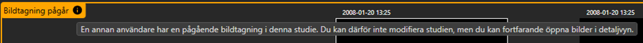 När muspekaren förs över texten "Bildtagning pågår" visas ytterligare information kring vad detta innebär för användaren: "En annan användare har en pågående bildtagning i denna studie. Du kan därför inte modifiera studien, men du kan fortfarande öppna bilder i detaljvyn".