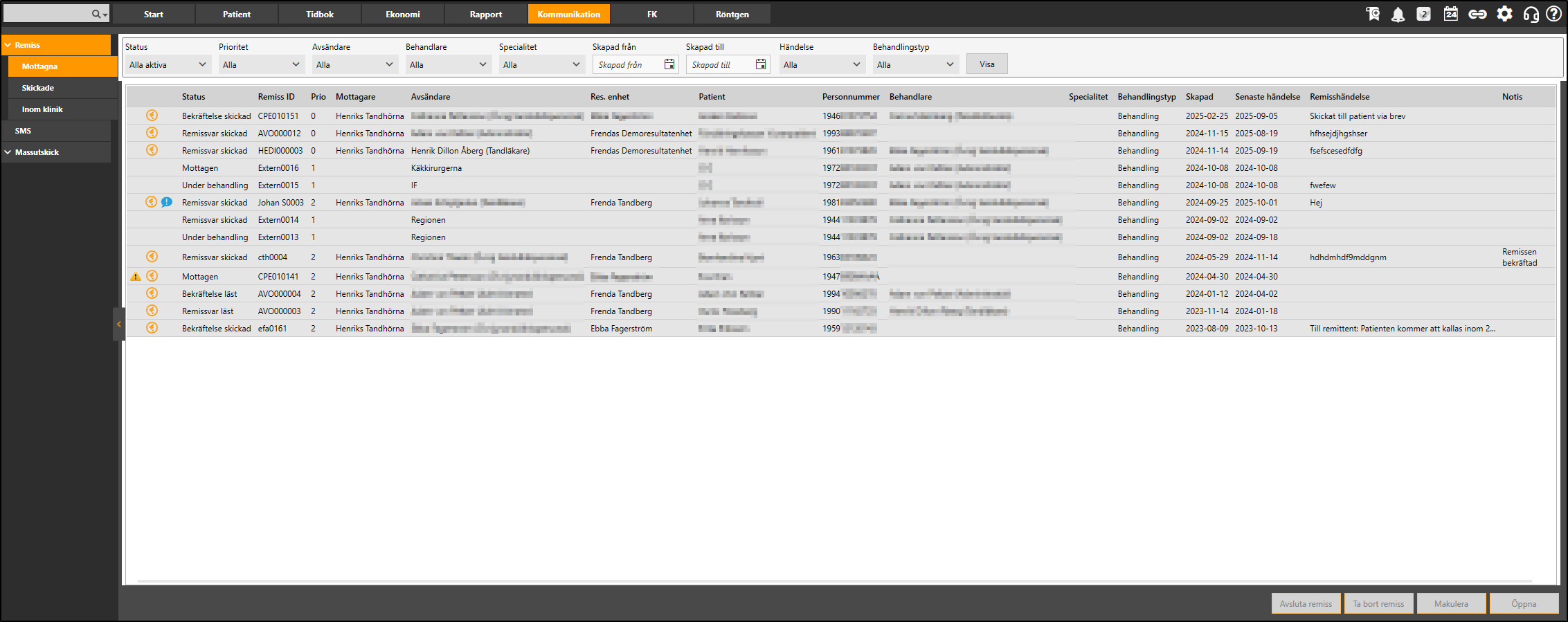 I listan presenteras aktiva remisser och med senast mottagen remiss överst. Visningsordning kan ändras genom att klicka på respektive kolumn. Vid dubbelklick på remiss visas information om vald patient i patientlist.
